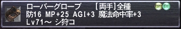 ローバーグローブ[両手]防16 MP+25 AGI+3 魔法命中率+3 Lv71~ シ狩コ(ER